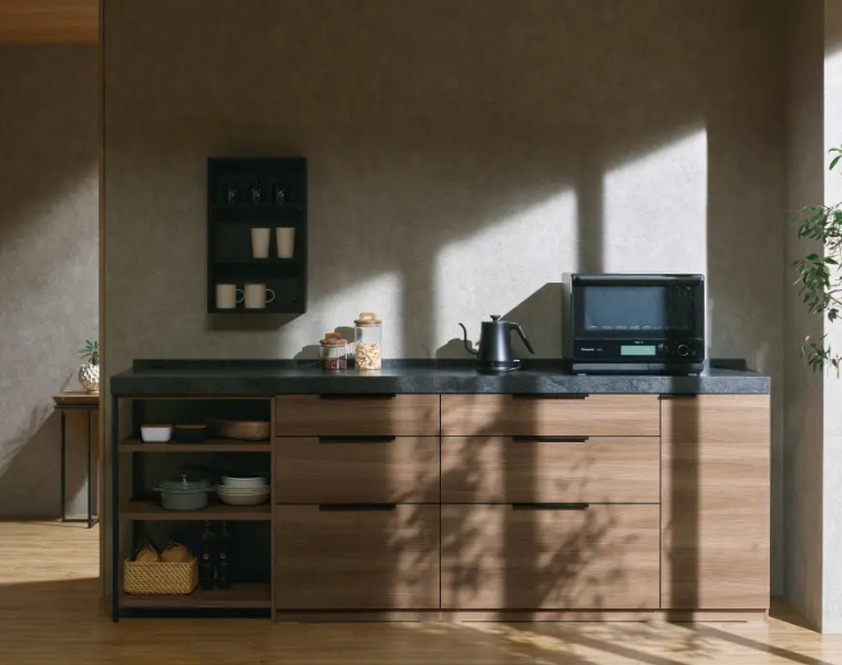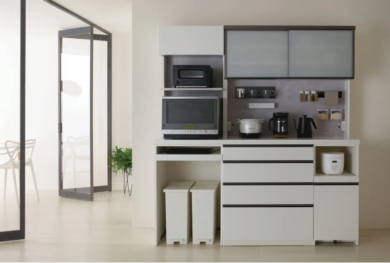 また、棚板の高さ調整や大型収納スペースなど、キッチンの必需品を効率よく収納できる設計です。